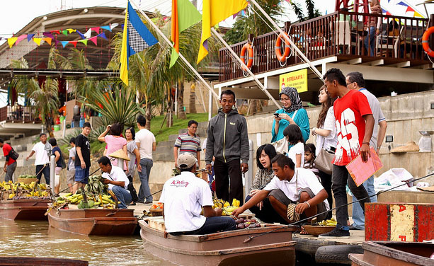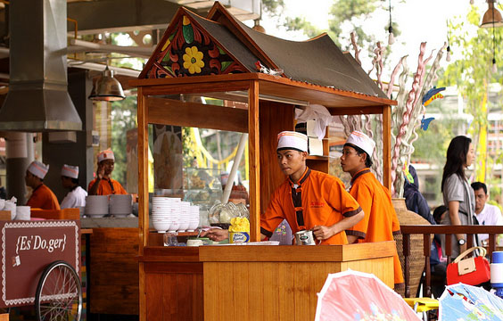 Puas berfoto di tetamanan, beranjaklah kita menyeberangi jembatan yang keren banget. Jembatan ini persis di atas sungai yang dibawahnya mengalir deras. Ini sungai Cikeas. Berfoto disini, latar belakangnya sungai dan kubah Masjid yang menjulang. Kurang indah apa…Dan, sampailah kitaaah di Wisata Kuliner! Aneka makanan, minuman, cemilan, lengkap semua, dan rasanya SUPER. Di Ah Poong ini, sistem pembayarannya dengan kartu. Jadi kita wajib beli kartu dulu di satu kasir. Istilahnya prabayar lah. Agak rempong sih. Harus bolak-balik isi ulang kartu. Nggak praktis. Belum lagi ditambah nggak berlakunya “pembeli adalah raja” di tempat ini. Jadi kalau lo mau belanja, ya sudah datang ke cornernya, pesan, dan silakan ambil sendiri (si pelayan nggak mau nganterin). Perlu sambal? Yaudah ambil sendiri. Hmm.