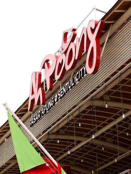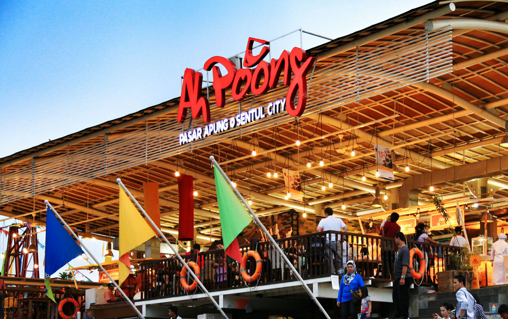 Puas berfoto di tetamanan, beranjaklah kita menyeberangi jembatan yang keren banget. Jembatan ini persis di atas sungai yang dibawahnya mengalir deras. Ini sungai Cikeas. Berfoto disini, latar belakangnya sungai dan kubah Masjid yang menjulang. Kurang indah apa…Dan, sampailah kitaaah di Wisata Kuliner! Aneka makanan, minuman, cemilan, lengkap semua, dan rasanya SUPER. Di Ah Poong ini, sistem pembayarannya dengan kartu. Jadi kita wajib beli kartu dulu di satu kasir. Istilahnya prabayar lah. Agak rempong sih. Harus bolak-balik isi ulang kartu. Nggak praktis. Belum lagi ditambah nggak berlakunya “pembeli adalah raja” di tempat ini. Jadi kalau lo mau belanja, ya sudah datang ke cornernya, pesan, dan silakan ambil sendiri (si pelayan nggak mau nganterin). Perlu sambal? Yaudah ambil sendiri. Hmm.