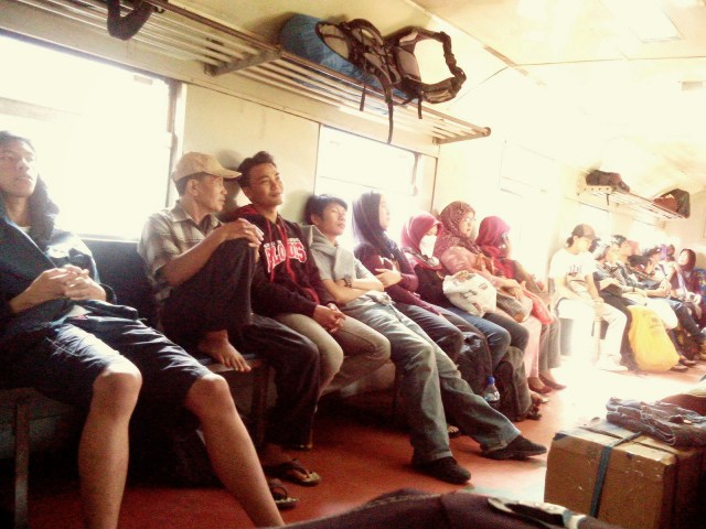 Jangan bayangkan KRL, atau kereta api jarak jauh. Ini kereta ekonomi yang ayam dan kambing-pun rasanya masih bisa masuk. Kursinya 90 derajat, dan tentu tak empuk. AC? Kipas anginpun gak ada. Tapi gue pribadi menikmatinya, dan sesekali sibuk mengarahkan mata kamera ke beberapa titik. Pedagang asongan berlalu lalang, menjajakan Sanqua sampai nasi uduk.