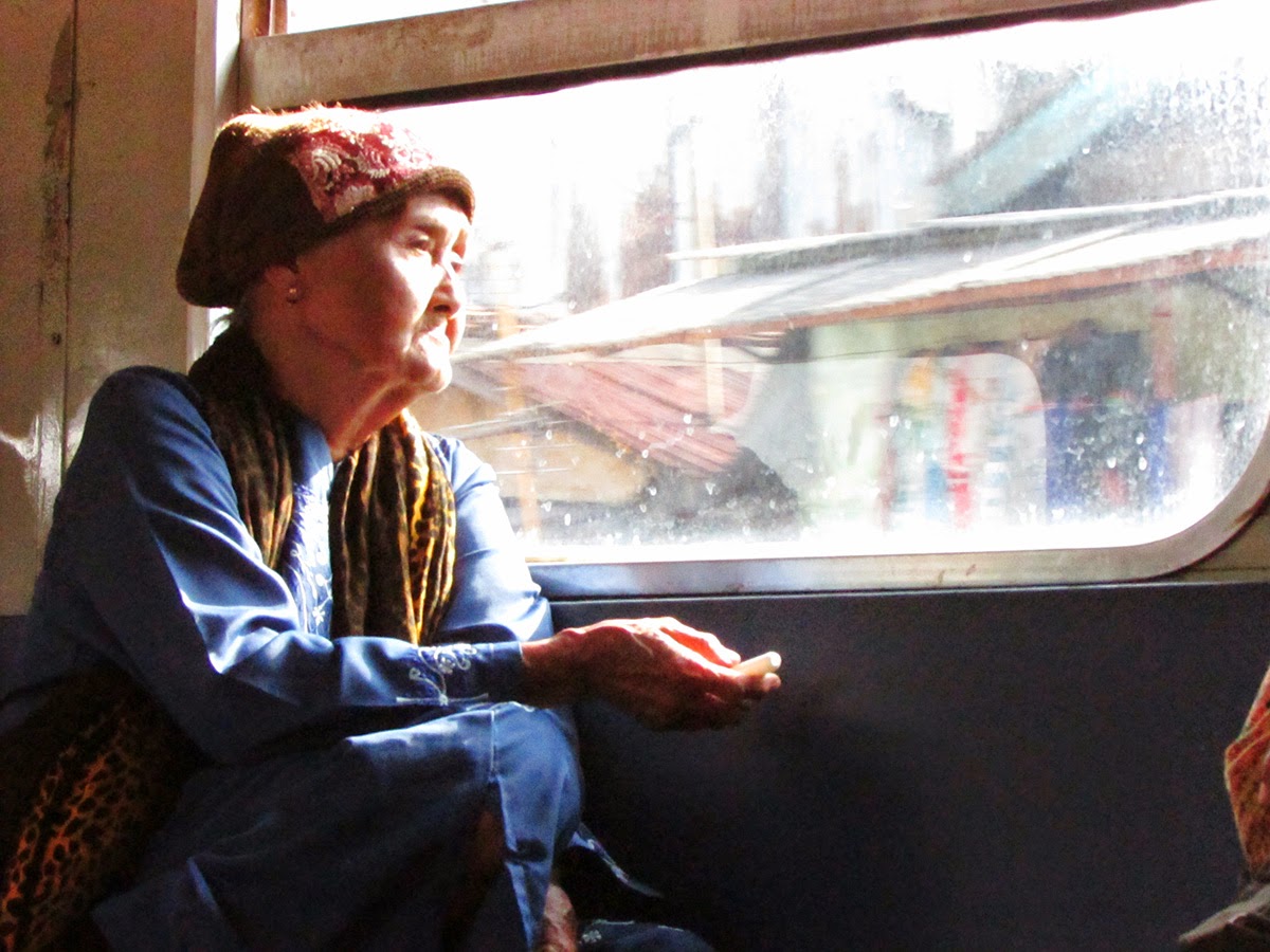 Jangan bayangkan KRL, atau kereta api jarak jauh. Ini kereta ekonomi yang ayam dan kambing-pun rasanya masih bisa masuk. Kursinya 90 derajat, dan tentu tak empuk. AC? Kipas anginpun gak ada. Tapi gue pribadi menikmatinya, dan sesekali sibuk mengarahkan mata kamera ke beberapa titik. Pedagang asongan berlalu lalang, menjajakan Sanqua sampai nasi uduk.