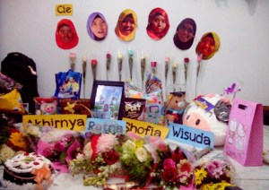 Teman berbagi ruang 3×3 meter satu tahun. Dan 3 tahun selanjutnya udah kayak keluarga. Ditambah Umil dan Chella 😀 Makasih yaaah. Kuenya, bonekanya, bunganya, gelasnya, coklatnya, semuanyaa 😉