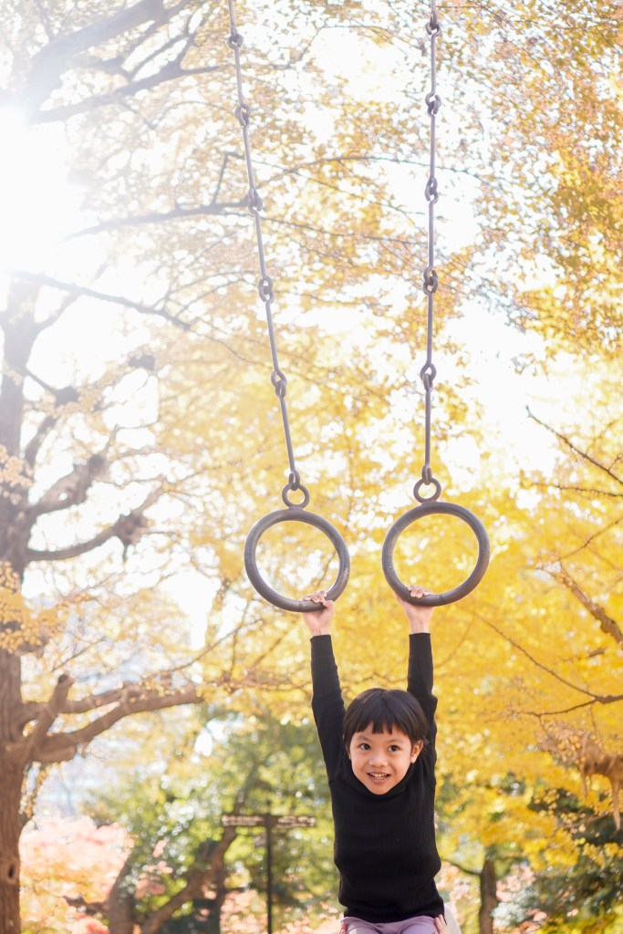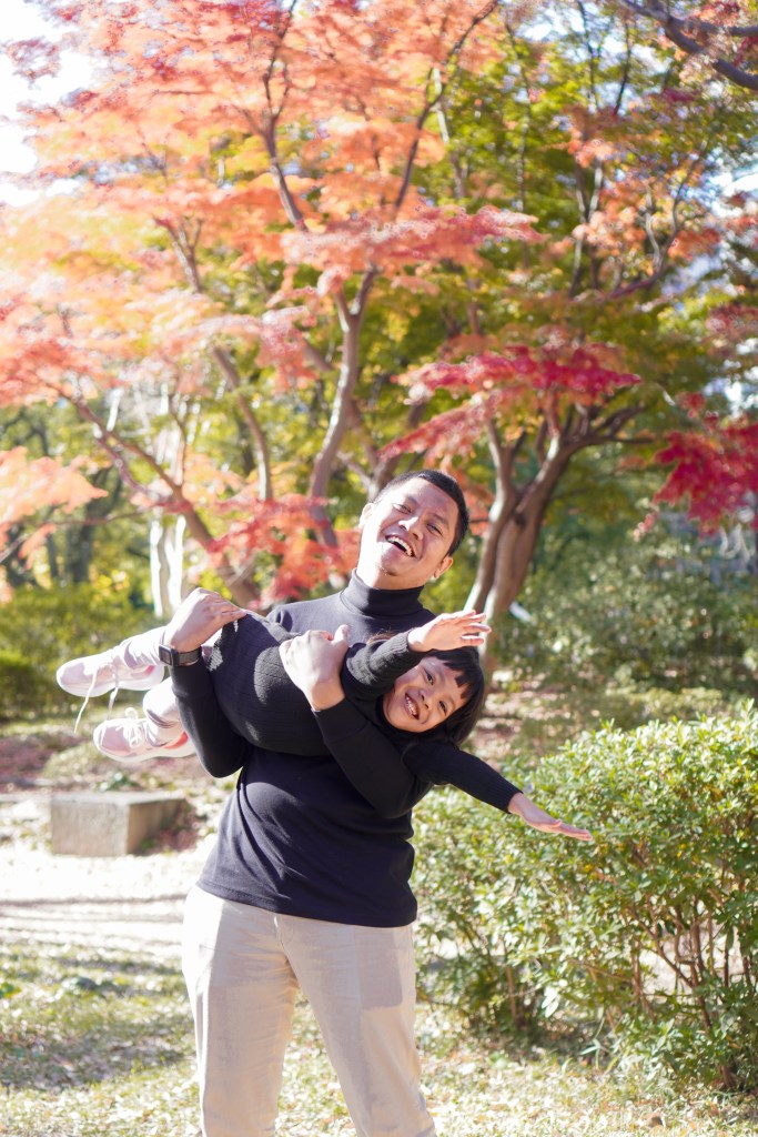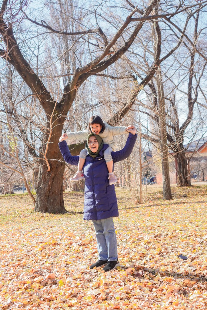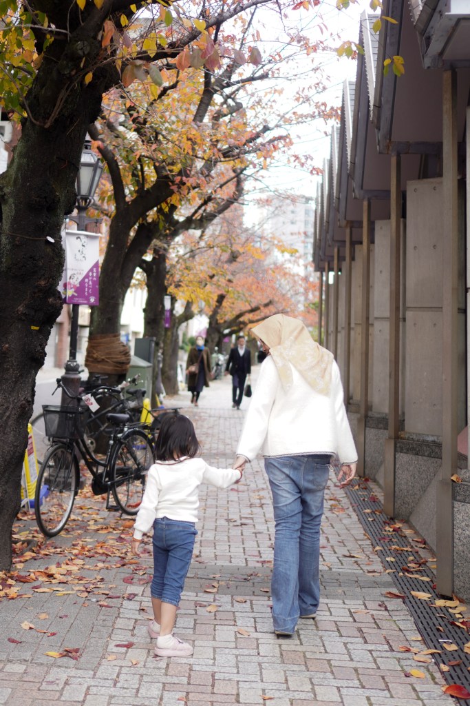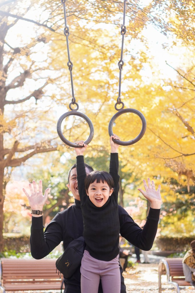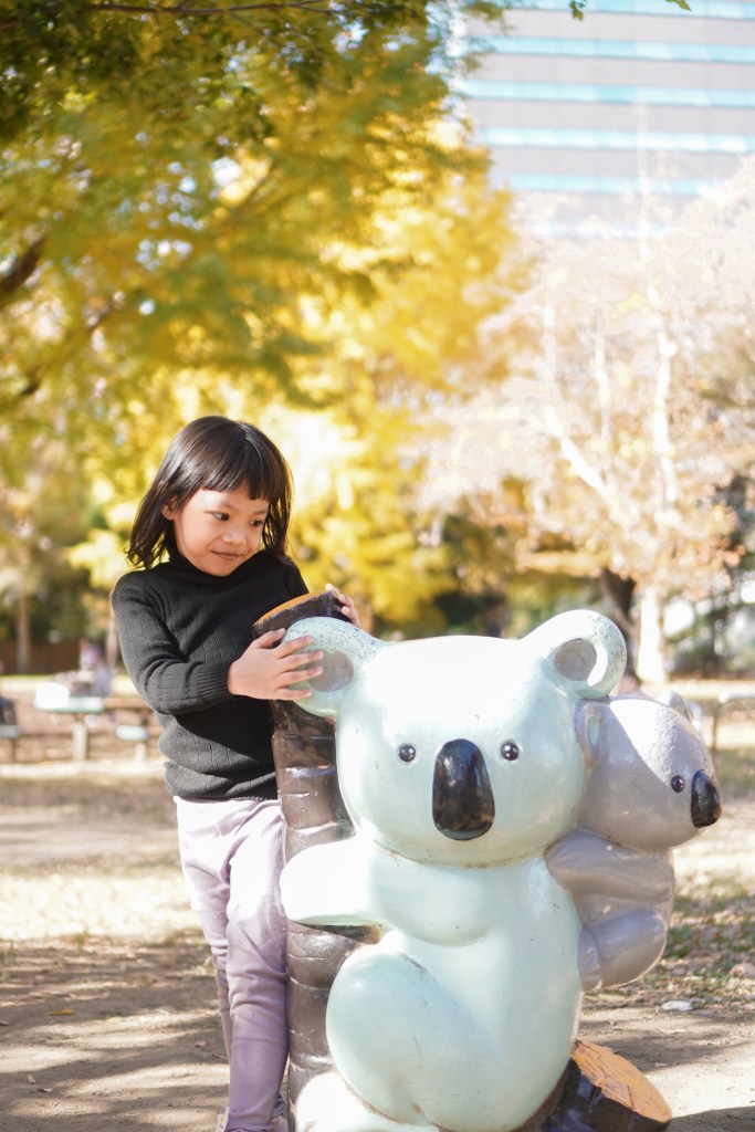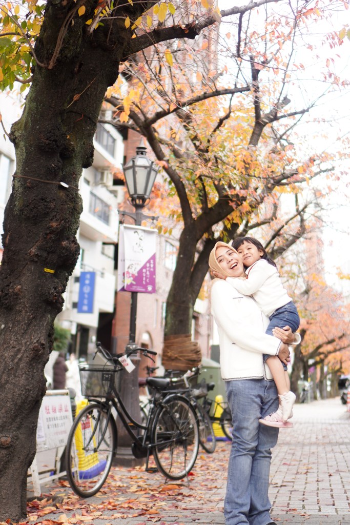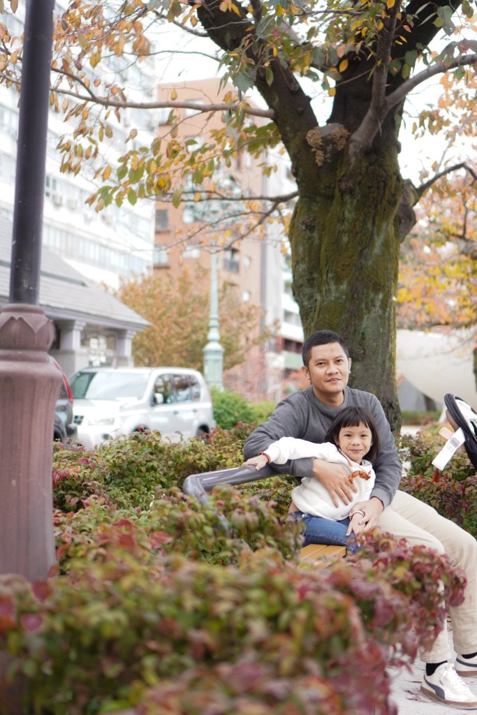 Hari kedua kami putuskan ke Ginza dengan tujuan utama : Hibiya Park. Sangat gampang aksesnya, cukup satu kali turun kereta dari stasiun sebelah hotel kami. Hibiya Park saat itu, benar-benar terasa seperti milik lokal seutuhnya. Tanpa banyak tourist, hanya ramai warga setempat. Hibiya Park menyuguhkan suasana autumn yang sesungguhnya. Daun-daun merah dan tone kuning yang seluruhnya berguguran. Akh, terasa hidup dan ramah anak. Mik berlarian, mencoba berbagai aktivitas kecil, dan main bersama warga lokal. Dia gelantungan, main ayunan, manjat berbagai perosotan, mengumpulkan daun, dan penuh dengan gelak tawa. Saya sesekali potret Mik dengan kamera. Senyumnya utuh, tidak dibuat-buat. Hahaha.