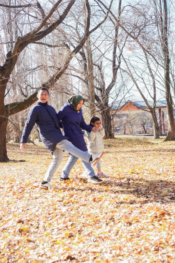 Pagi kedua di Fuji adalah favorit saya. Kami bangun lebih awal, sarapan, lalu berjalan beriringan mengitari jalanan Kawaguchiko yang sengang. Kami duduk lama di taman tepi Danau, bermain daun gugur sambil mengunyah snack yang kami bawa. Berfoto-foto dengan Tripod, dan Mik seperti biasa lari riang gembira. Dia mengikuti semua arahan foto kami wkwk.
